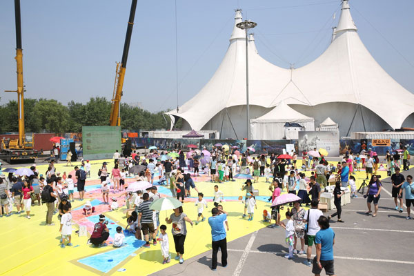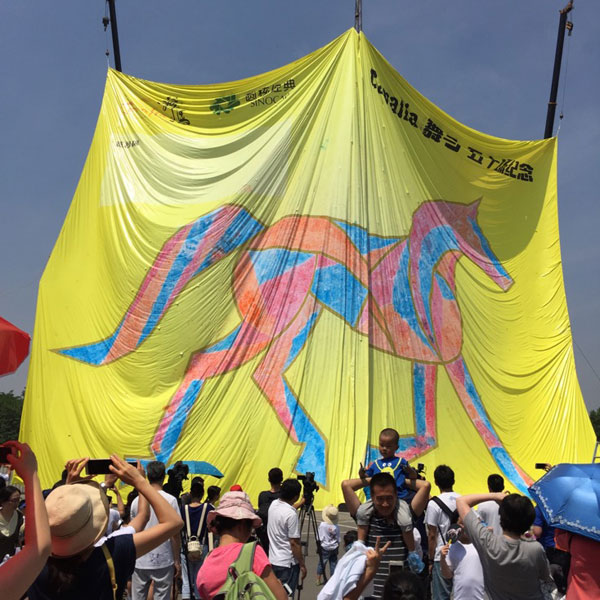 日前,舞台秀《Cavalia·舞马》在北京朝阳公园Cavalia城堡举行了《爱马 画马 童心 爱心 齐心共创吉尼斯》五十场纪念活动,得到了200多个亲子家庭的踊跃参与,成员均为5-12岁的爱马并喜爱艺术的孩子和他们的家长。此次活动几百人在面积为1200平方米的画布上共同作画,挑战世界上“最大画幅的马”这项吉尼斯纪录。根据世界吉尼斯记载,此前是一幅来自法国的1120平方米的3D画作保持着这一纪录。