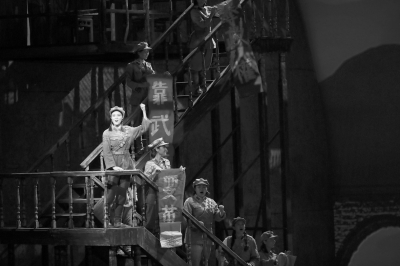 在国家大剧院原创歌剧《长征》中,导演田沁鑫、杨笑阳以兼具史诗感与时代感的舞台呈现,表现出红军战士在艰苦环境中,凭借着信仰的力量,由绝境步入辉煌的过程,突显了红军长征“行走的力量”。在上半场瑞金、湘江、遵义、泸定桥等场次中,有着建筑感的舞美与丰富的多媒体视觉效果,将不同地区的地理风貌与人文风情,运用中国艺术特有的写意精神在舞台上得以呈现。与此同时,山西省吕梁市民间艺术团的舞蹈演员,将红军一天一夜两百四十里的奔袭、飞夺泸定桥的艰险,在舞台上表现得惊心动魄。