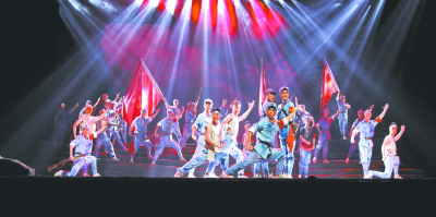 舞台前沿,漆黑冰冷的大铁链横贯左右;舞台远处,波涛汹涌的大渡河壮观衬映其后。浙江京剧团的演员扮演的红军敢死队战士,在舞台的“枪林弹雨”中匍匐、跳跃、翻滚着……一场宏大震撼的京剧“飞夺泸定桥”给观众带来了与传统戏曲不一样的视听享受。