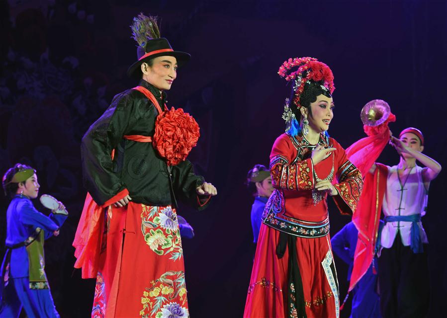 11月10日,云南玉溪市滇剧院演员在表演滇剧《水莽草》。 当日,2016年云南省花灯滇剧艺术周在云南省丘北县椒莲广场拉开帷幕。新华社记者 杨宗友 摄