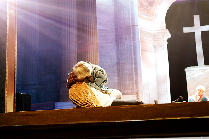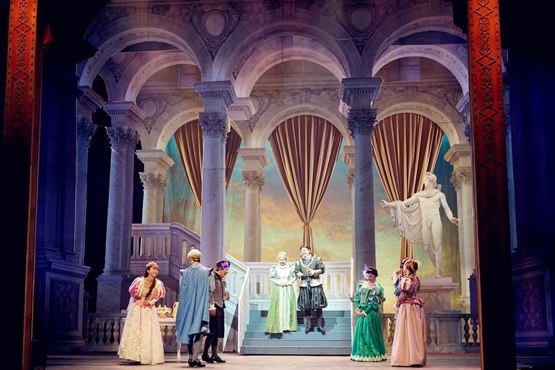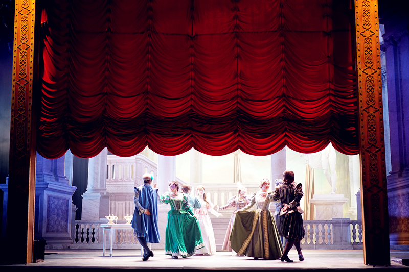 开心麻花对莎剧的解读,也体现在对舞美的苛求上。科林斯立柱、大卫雕塑、拉夫领大裙摆……幕布拉开,观众仿佛置身于中世纪欧洲宫廷之中,台侧则搭建了象征着现代文明的设备器械、钢筋铁架。莎士比亚的画像犹如太阳,高悬在舞台的最顶端,凝视着剧场里发生的一切。