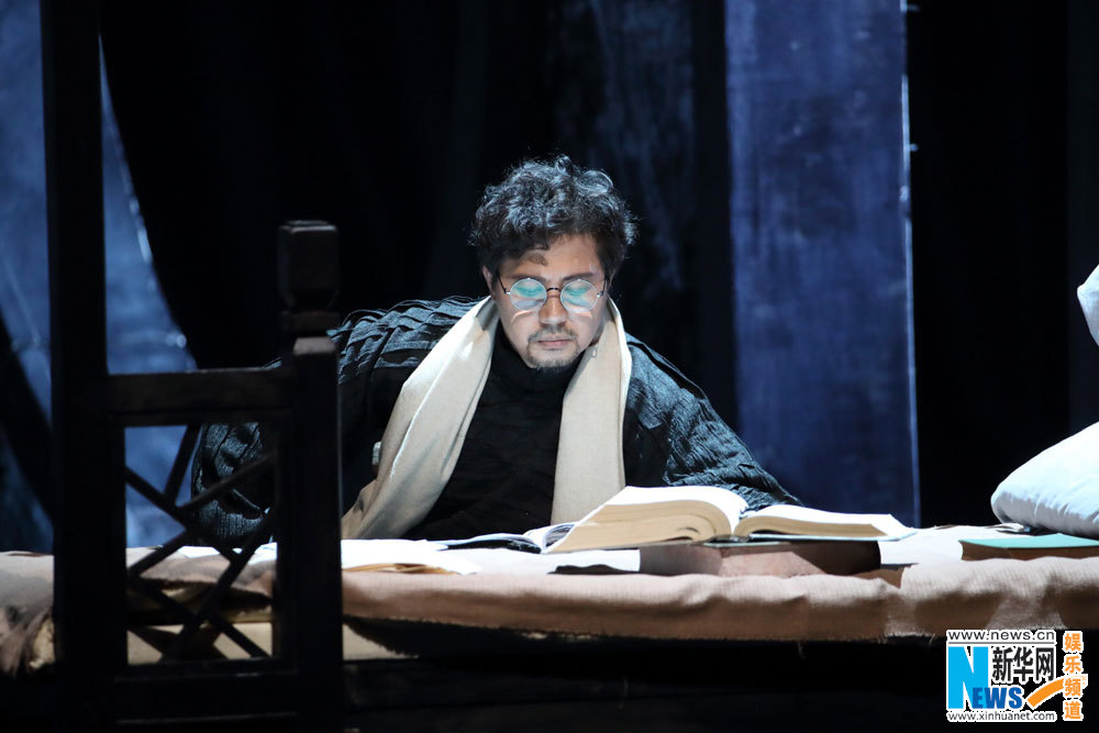 当晚,国家大剧院戏剧场的舞台融合了东西方建筑元素的特点,将江南的屋檐、后花园与丹麦王室的欧式城堡结合在一起。在震人心魄的入侵者的轰炸声中,佟瑞欣饰演的朱生豪在破旧的床上笔耕不辍地翻译着,当他的手稿再次被炸毁,烧焦的译稿散落在舞台中央,他扼腕感叹:“是生存还是毁灭,这是一个不容思考的问题”,由此揭开了该剧对于《哈姆雷特》的诠释视角。炮火声中丹麦邮号响起,朱生豪眼前仿佛出现了危机暗藏的丹麦王室。由王诗槐、凯丽饰演的国王克劳狄斯与王后乔特鲁德登上舞台中央的菱形平台,弑兄篡位的克劳狄斯正准备迎娶这位新寡的嫂子,而哈姆雷特却身着丧服徐徐登场。在剧中,朱生豪、宋清如与哈姆雷特、奥菲利亚均由佟瑞欣和朱杰分饰,二人的服装造型也别有心意。导演陈薪伊曾阐述道:“在宫廷戏部分,主要人物的服装和造型必须华贵,但只有一个人需要刻意地穿着丧服,那就是丹麦王子哈姆雷特。”午夜时分,老国王的灵魂告诉了哈姆雷特自己惨遭毒手的真相,并要求他进行复仇。伴随着柴科夫斯基《哈姆雷特幻想序曲》极具悲剧色彩的旋律,佟瑞欣将哈姆雷特由忧郁悲伤转向恐惧犹豫的细节演绎得十分到位。他用装疯来掩饰一系列变故带给他的沉重打击,这令深爱着他的两位女性——王后乔特鲁德和恋人奥菲利亚十分困惑,也备受折磨。在与母后的争吵中,哈姆雷特失手杀死了奥菲利亚的父亲,让奥菲利亚这抹全剧中最纯洁美好的色彩也覆上阴影。朱杰曾在国家大剧院的舞台上演绎了令人难忘的“简·爱”,而她对奥菲利亚的演绎也同样令人怜惜慨叹。当她双膝跪地喊出:“一颗多么高贵的心就这样陨落了!”,当她身着白衣头戴花环从娇俏明朗走向疯癫死亡时,莎翁笔下这一经典的女性形象则被饱满地呈现于舞台之上。