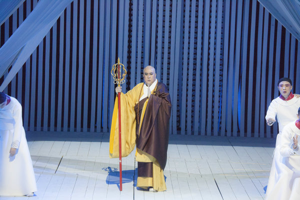 据悉,《鉴真东渡》全剧分为《幻海》、《愿海》、《迷海》、《觉海》、《心海》、《慧海》六个部分,以国际通识的歌剧语言,讲述了中国唐代高僧鉴真不畏艰险六次东渡日本弘法的故事,展开了一幅恢弘大气的中日文化交流历史画卷。该剧在音乐上借鉴了江苏民歌元素和佛教音乐的特点,无论是在作曲、戏剧结构、导演手法还是舞美设计等方面都大胆创新、构思精巧、匠心独运。