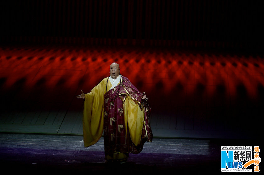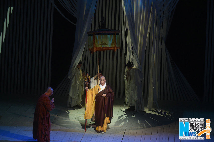 歌剧的另一大看点就是来自扬州大明寺的仁如法师。法师全程坐在舞台一侧的莲花座上吟诵《四智赞》《不动尊咒》《心经》等佛经法典。袅袅梵音,不仅强化了东渡弘法的特征,更在剧情中跳进跳出,起到了意想不到的推动作用。