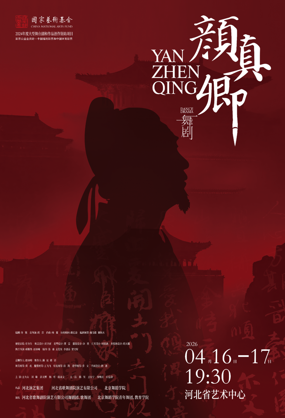 舞剧《颜真卿》为国家艺术基金2024年度大型舞台剧创作资助项目,河北演艺集团、河北省歌舞剧院演艺有限公司、北京舞蹈学院出品。获“第十五届全国舞蹈展演优秀剧目”称号,是近年来河北省新创舞剧市场票房最高和现象级文化IP。 本剧以唐代名臣、书法家颜真卿创作的“天下第二行书”《祭侄文稿》为叙事支点,将书法艺术与舞蹈语汇深度融合,通过“润墨、起笔、奋笔、枯笔、墨尽”五幕结构,将颜真卿跌宕起伏的人生境遇、书法艺术的墨韵流转与家国情怀交织呈现。